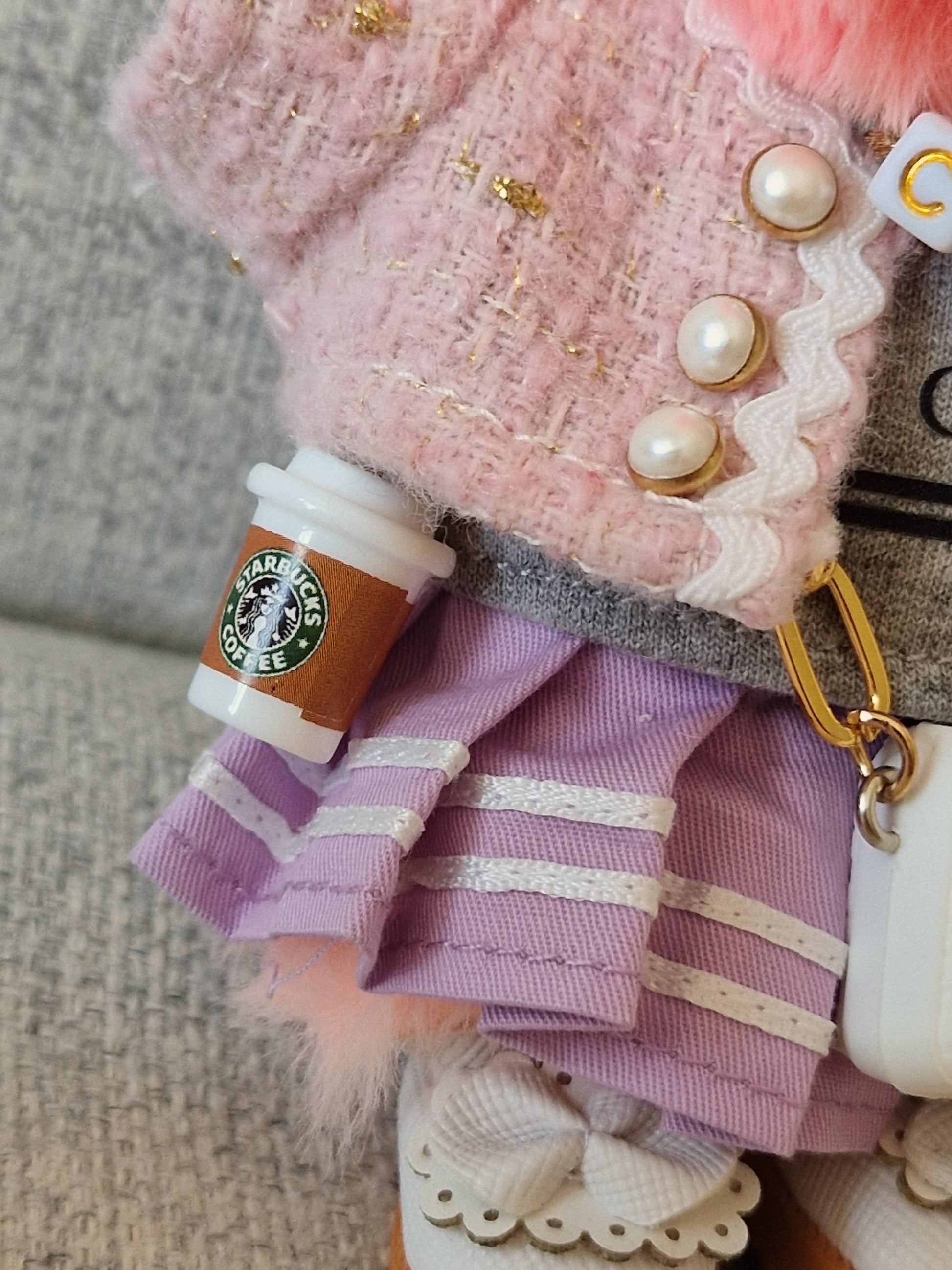 Complete with a designer tee, Starbucks cup, Dior bag, lilac skirt, Carrie necklace, and shoes - she's on the hunt for Mr. Big!