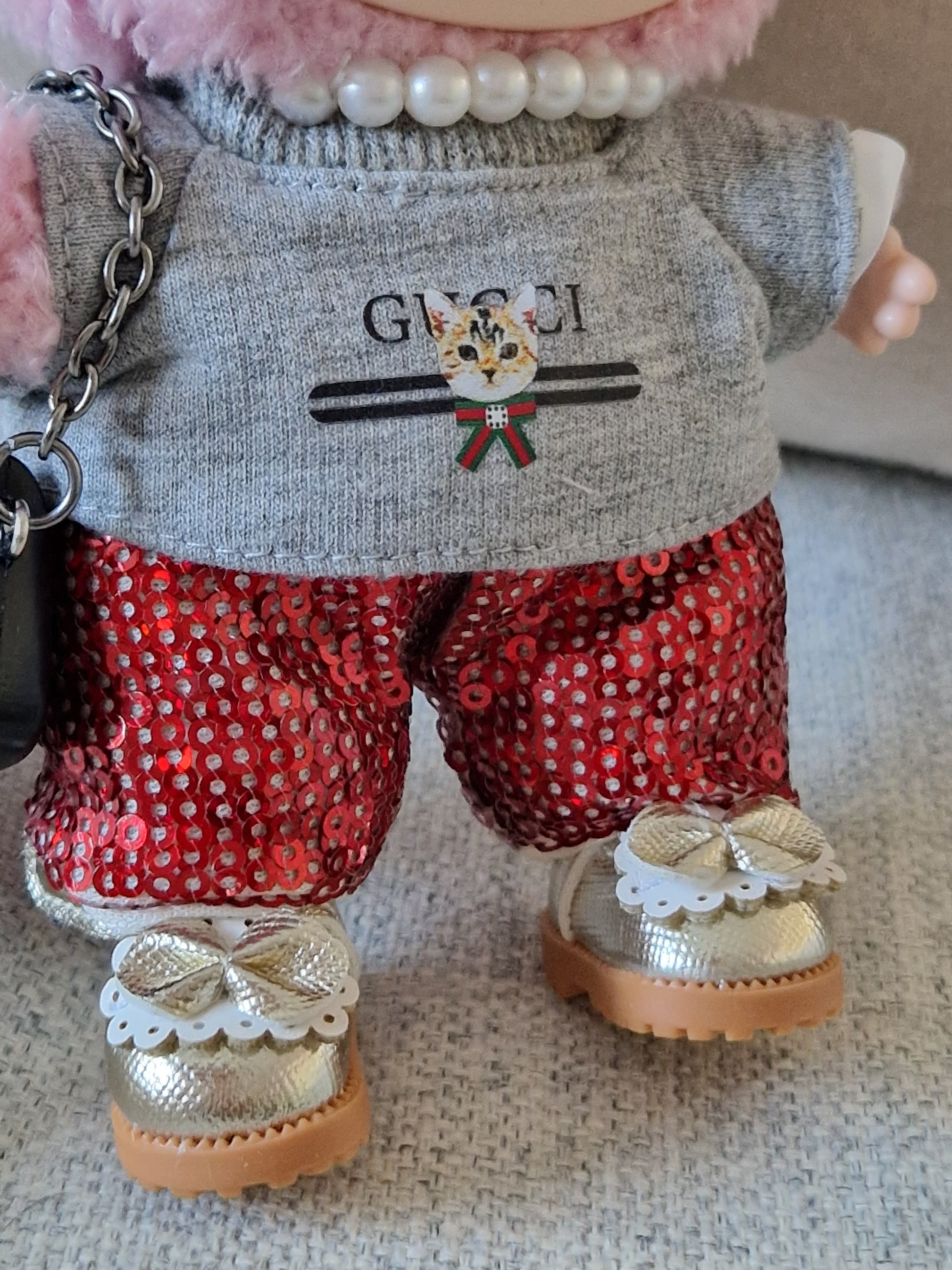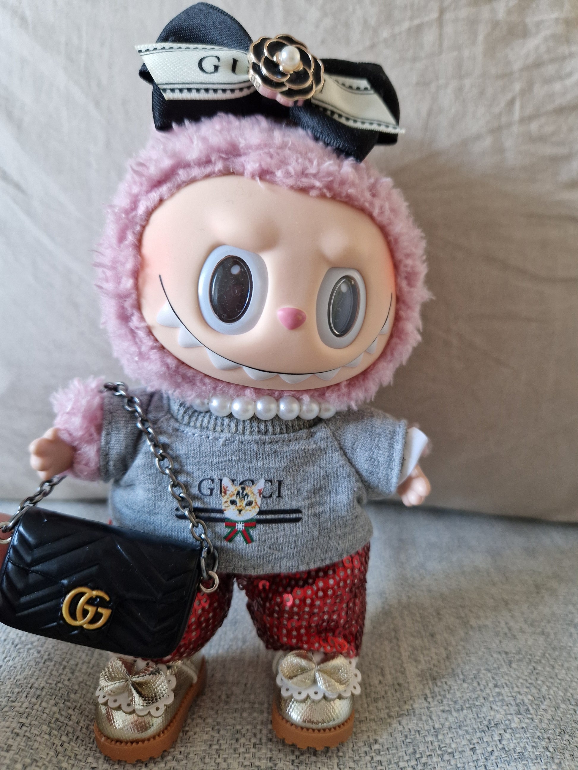 Introducing the Studio 54 Gucci Labubu - the epitome of disco glamour and energy. With sequin trousers, a Gucci tee, a Gucci Marmont handbag, and a headbow, this Labubu is perfect for dancing the night away and channeling the iconic fashion and celebrity culture of the disco era. Elevate your style with this must-have collector's item.