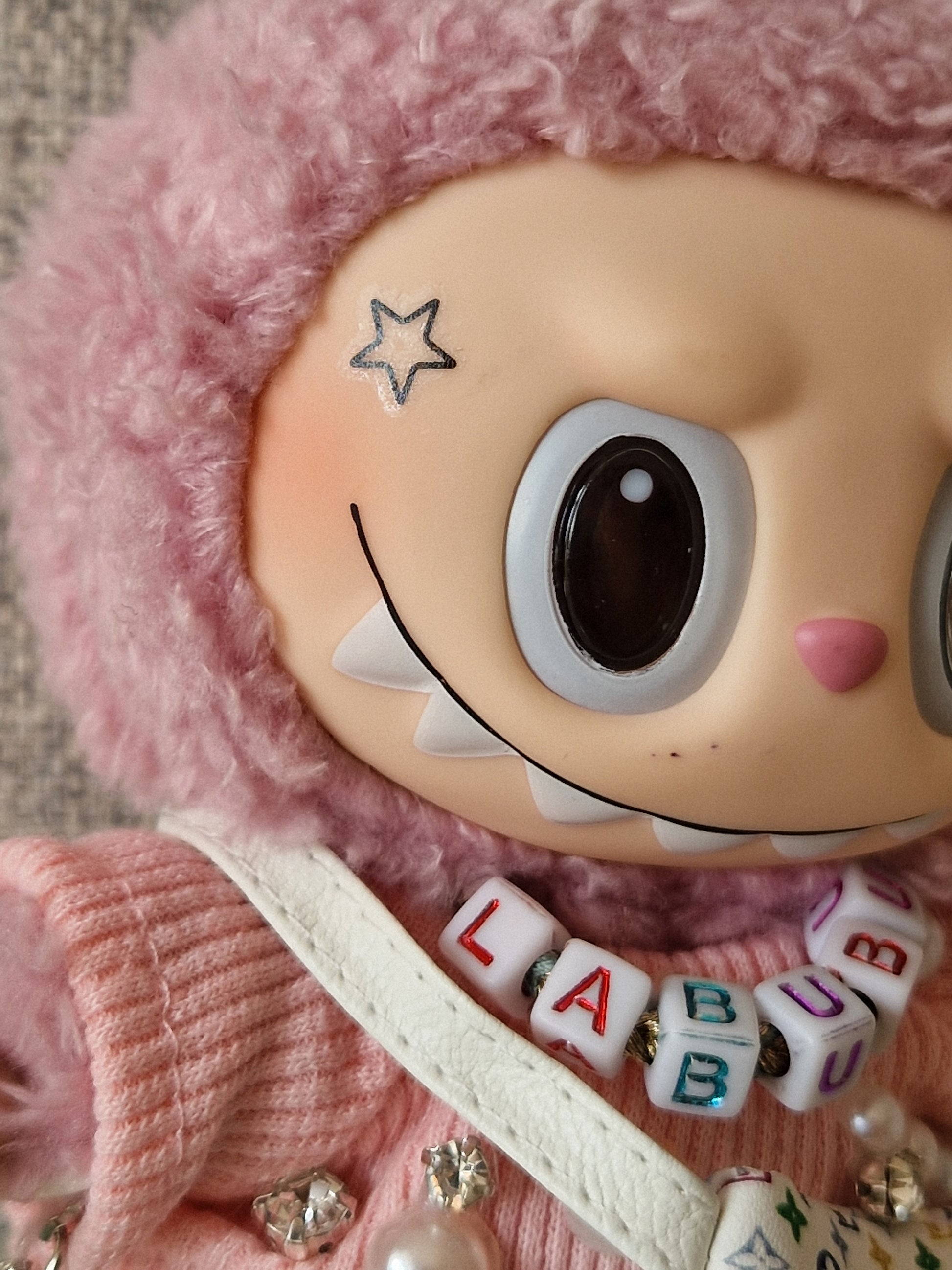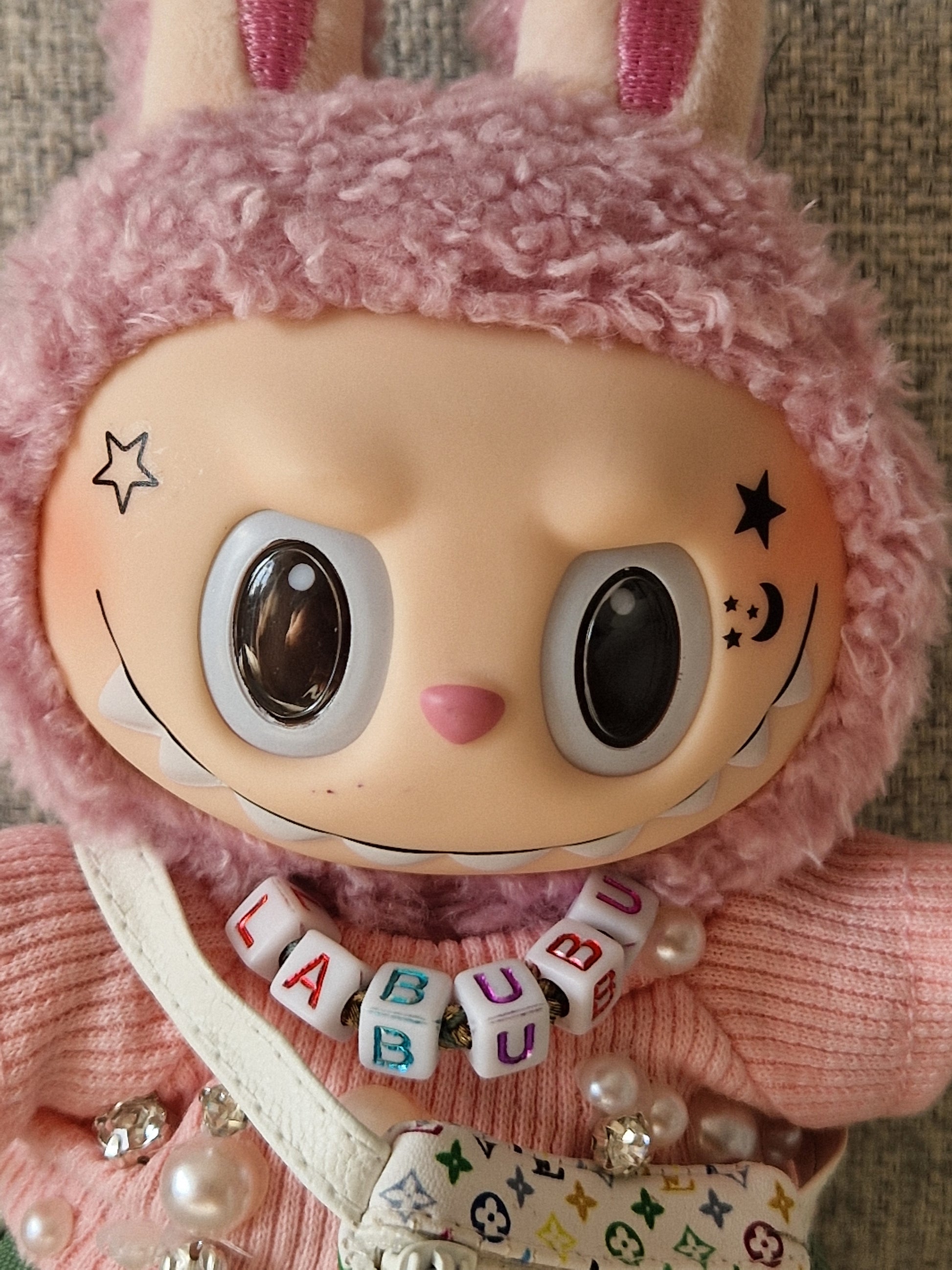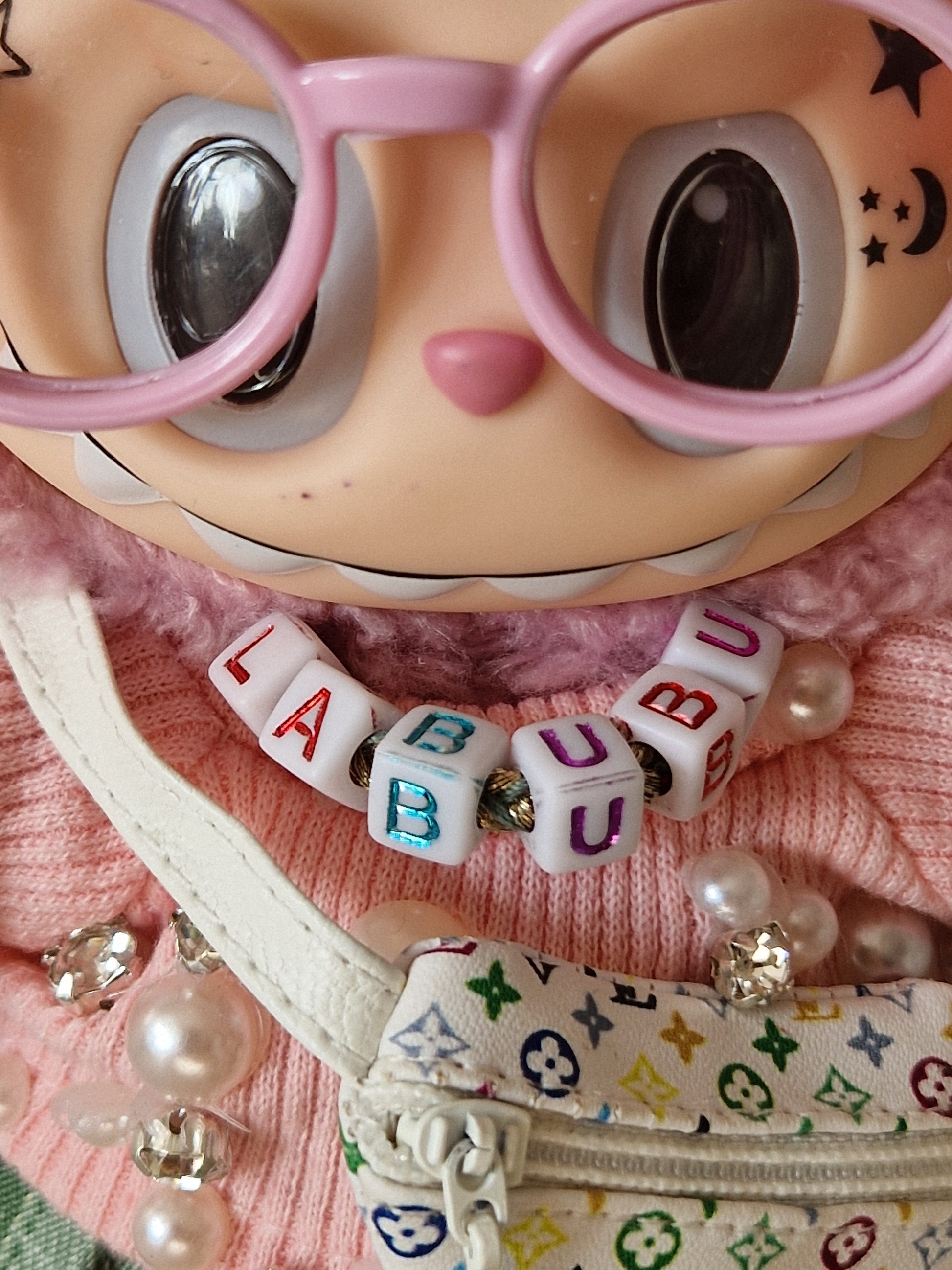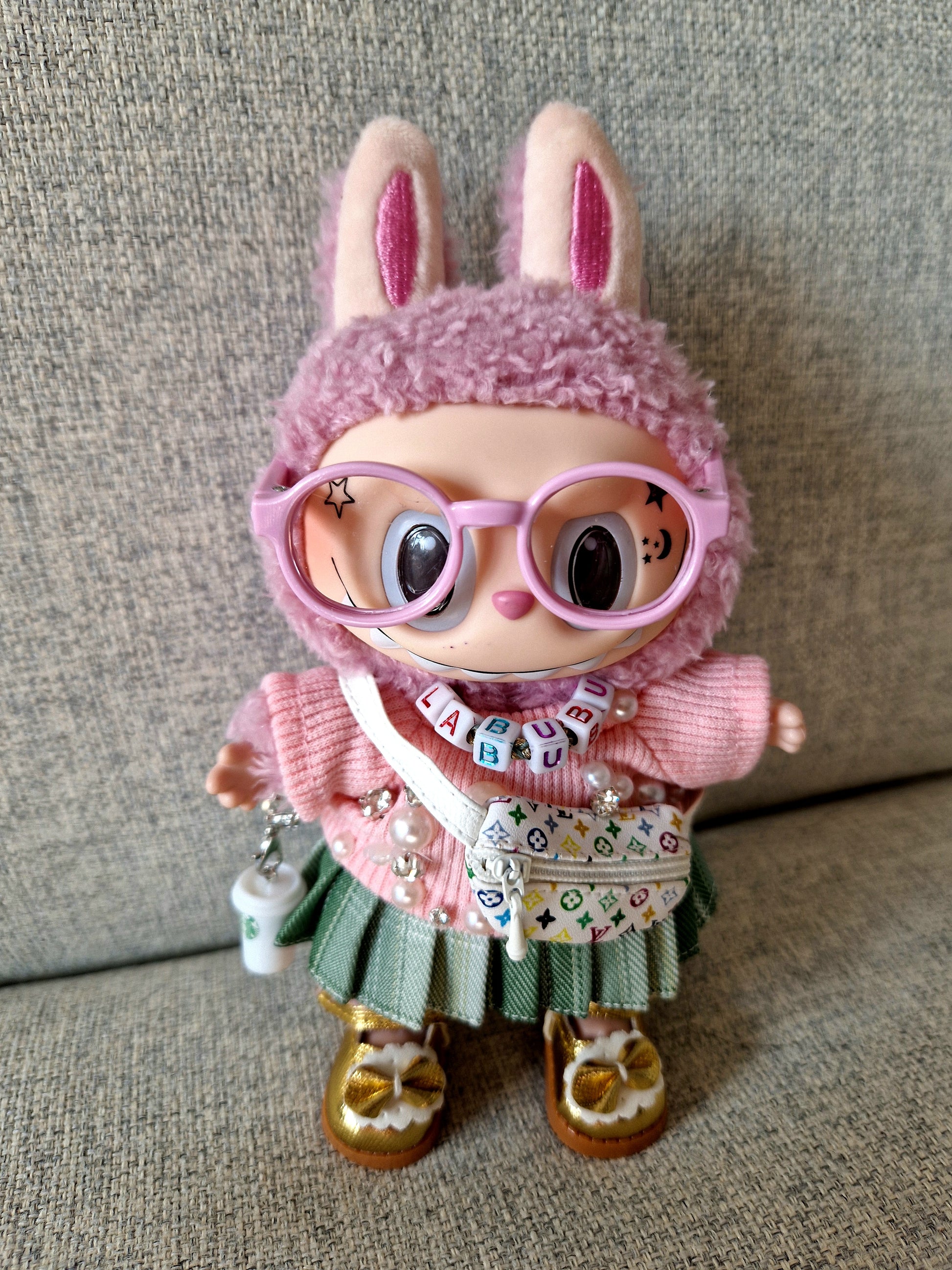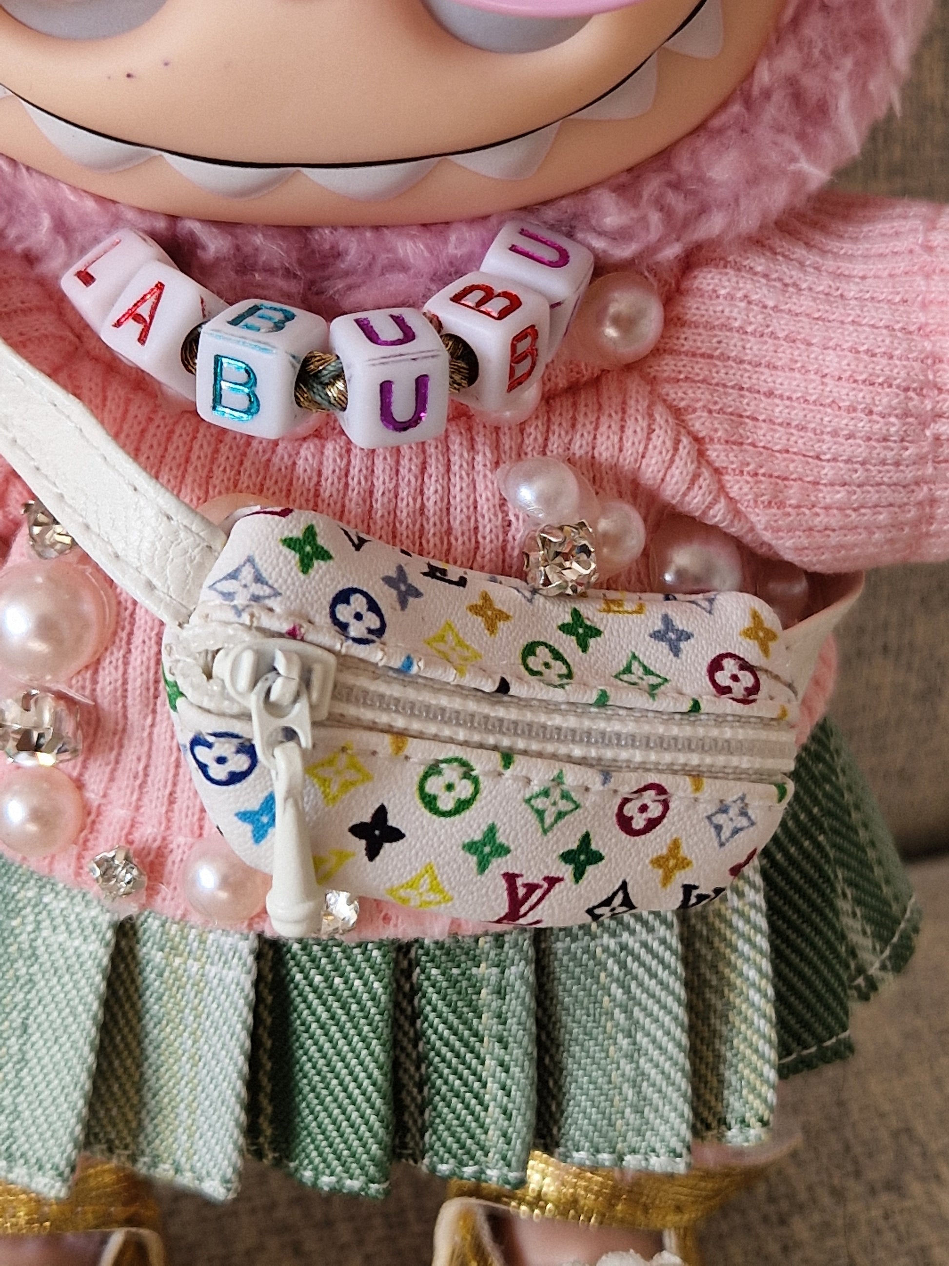 Introducing the Uni Bu Bu - a truly unique and bespoke Labubu for the new university term. This 100% Genuine Macaron Labubu has been customized in-house with tattoos, a bespoke necklace, designer bag, and more. All items are removable, transforming her back into the beloved Lychee Berry Labubu. Stand out with this one-of-a-kind creation.